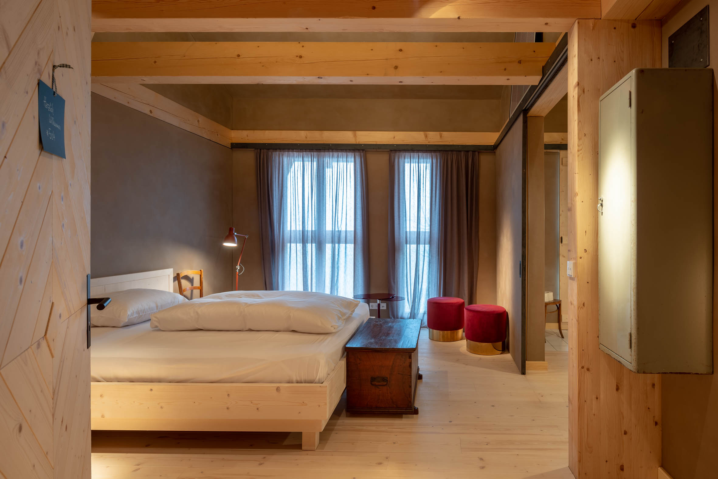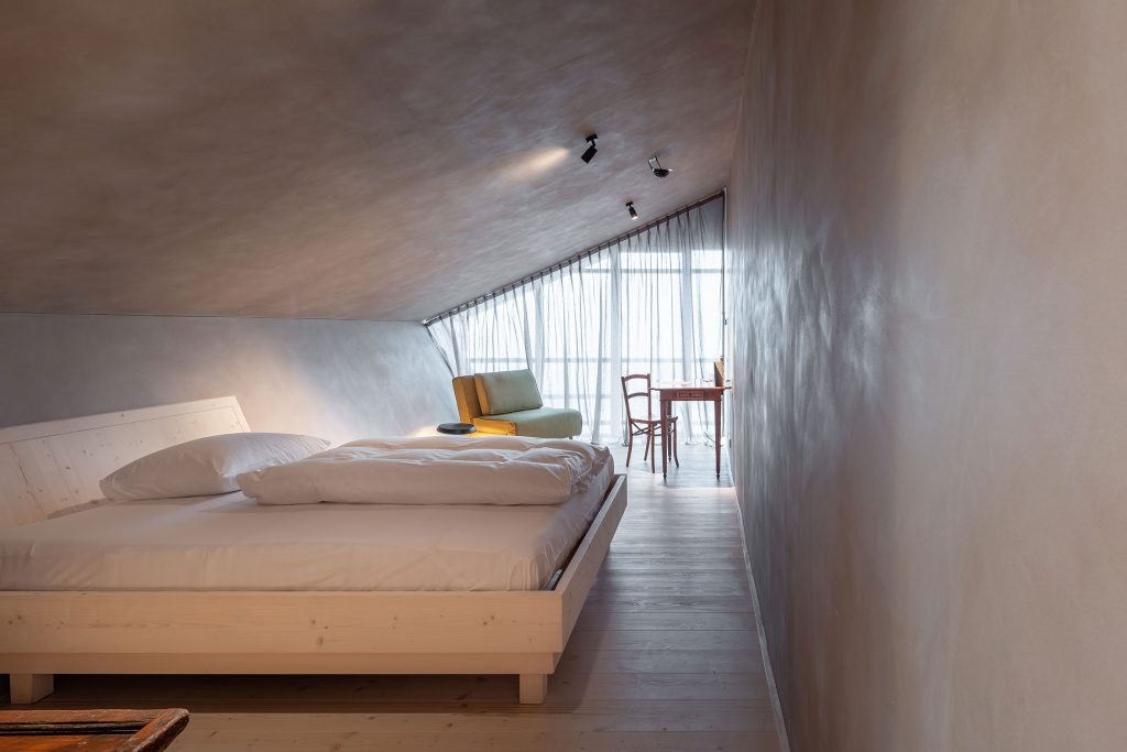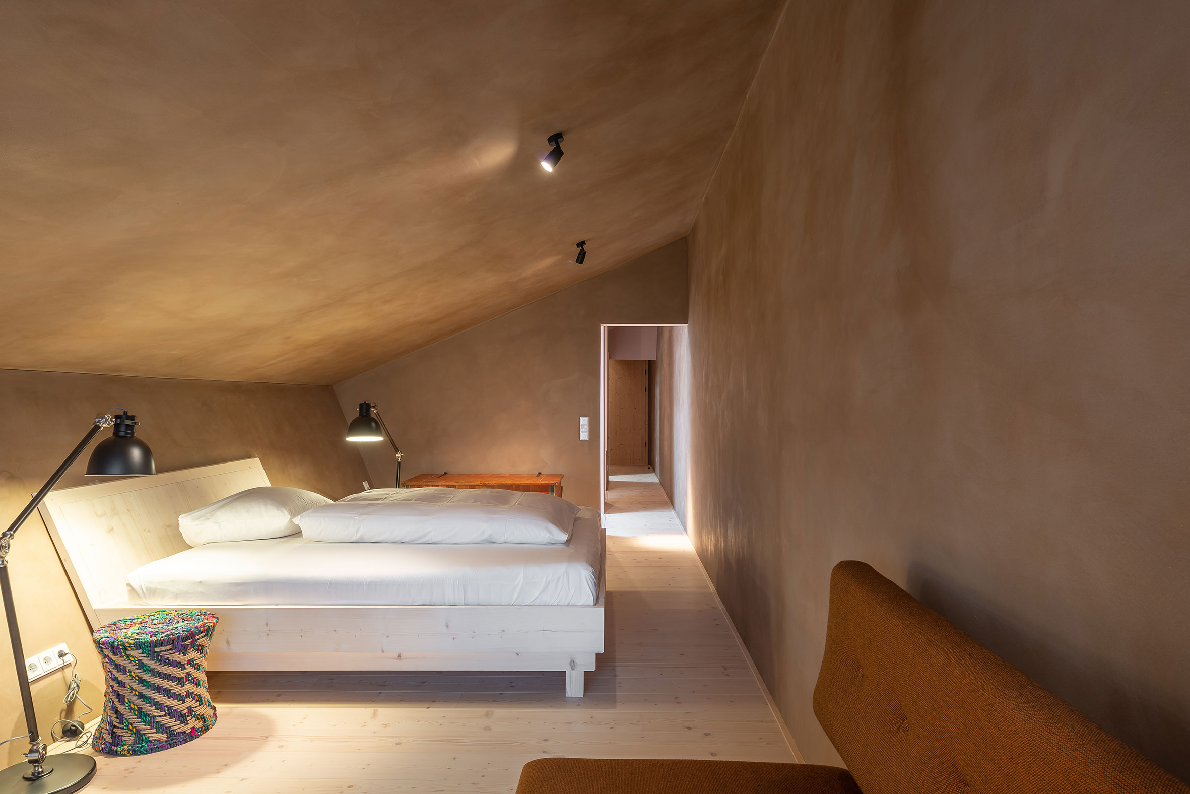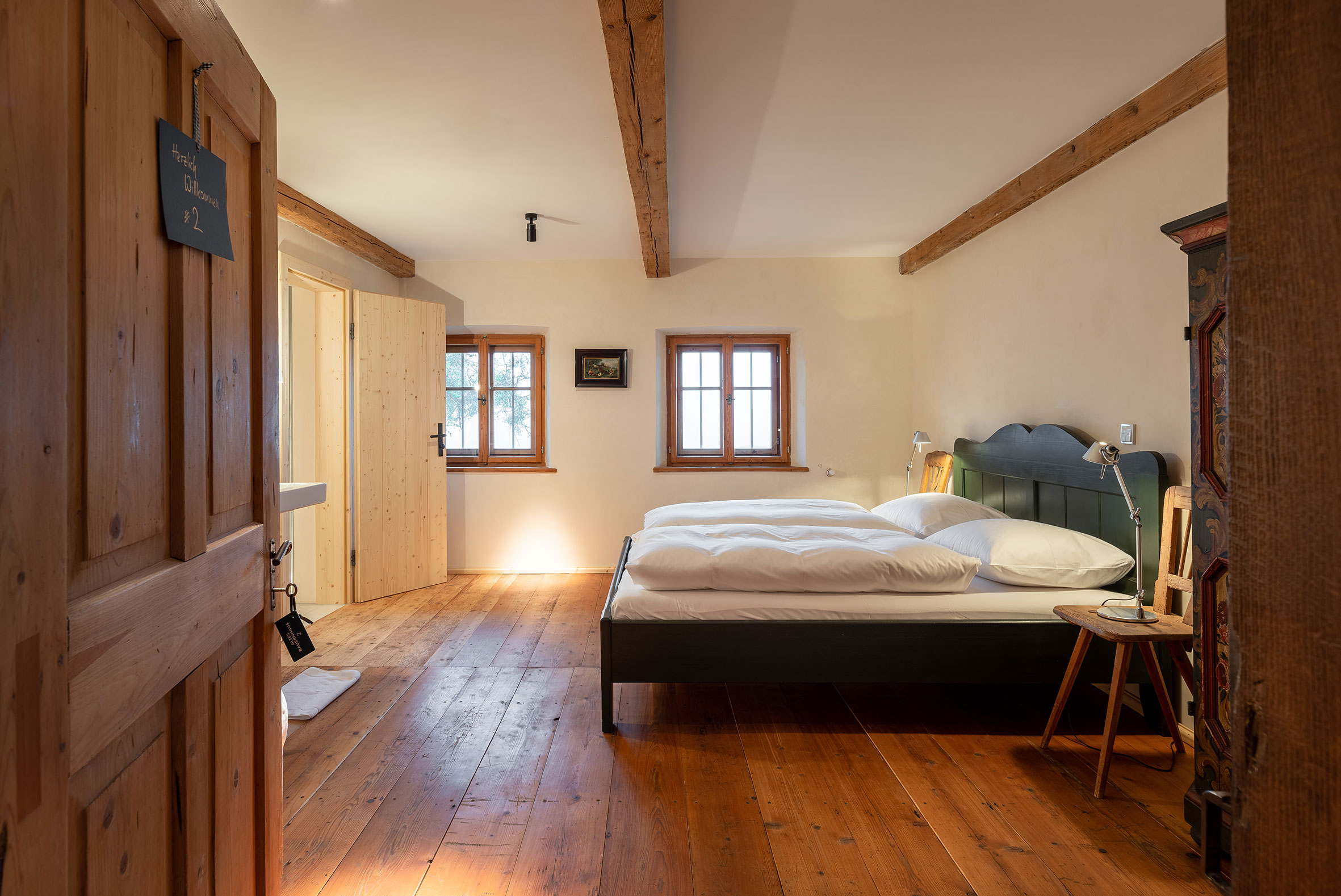 In den oberen Geschossen entstanden Gästezimmer, die auf zeitgenössische Weise an die bäuerliche Wohnkultur anknüpfen. Sichtbare Deckenbalken, Dielenböden und schlichte Bauernmöbel prägen die vier Bauernzimmer und die Bauernsuite. In den sogenannten Stallzimmern dominiert unbehandeltes Fichtenholz, kombiniert mit Lehmputz in erdigen Farbtönen – jedes Zimmer ein Unikat, jedes Detail durchdacht.