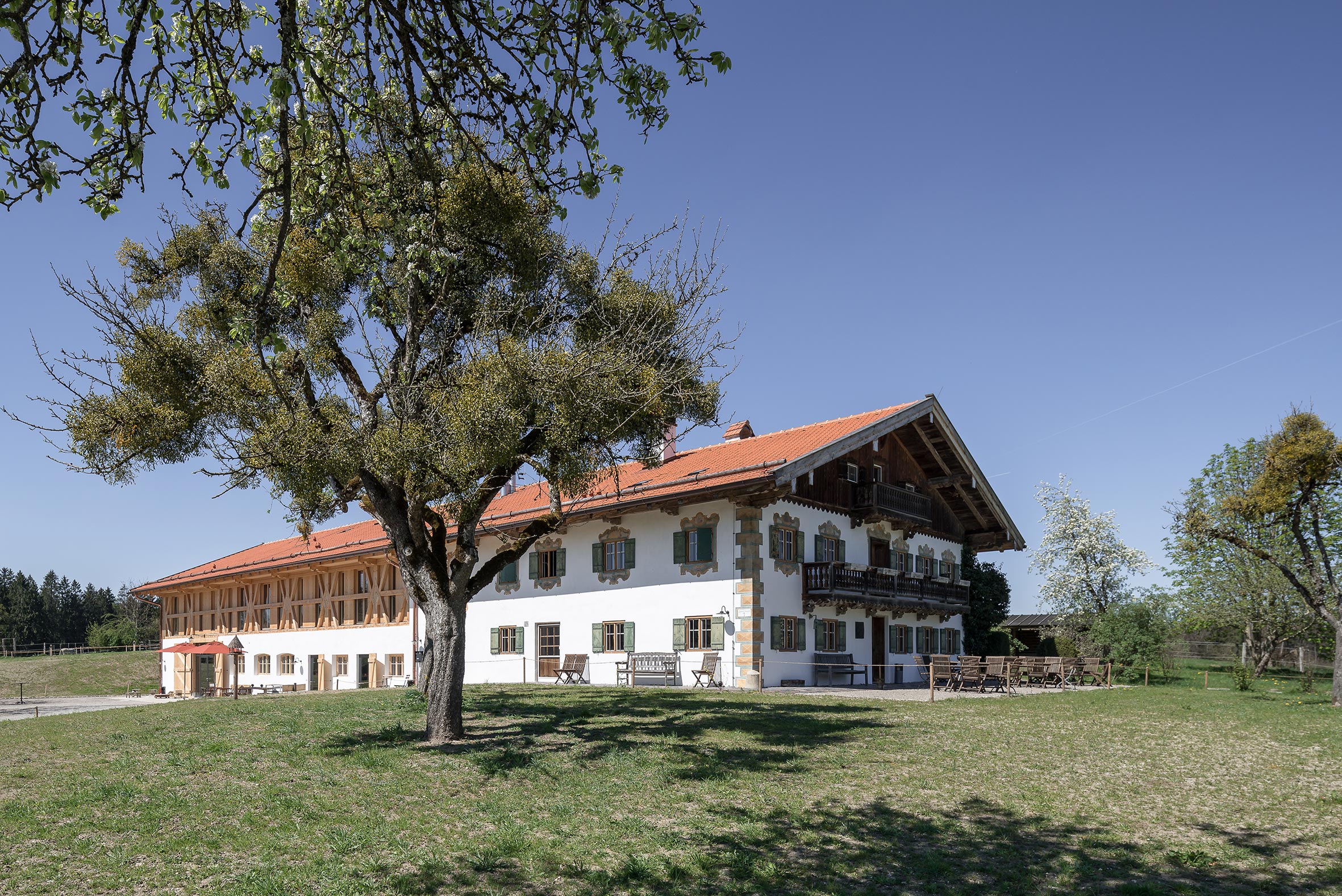 Zwischen Glonn und Moosach, südöstlich von München, liegt Gut Sonnenhausen – ein historisches Ensemble mit bewegter Vergangenheit: einst Herrensitz, später Bauernhof, dann Gestüt, Olympiastützpunkt, heute Biohotel. Das Herzstück dieser Geschichte ist ein Bauernhaus aus der Zeit um 1830. Nach einem verheerenden Brand im Jahr 2016, der den Stalltrakt fast vollständig zerstörte, entschloss sich Eigentümer Georg Schweisfurth zu einem kompromisslos ökologischen Wiederaufbau – nicht als Rekonstruktion, sondern als Weiterentwicklung im Geist des Ortes.