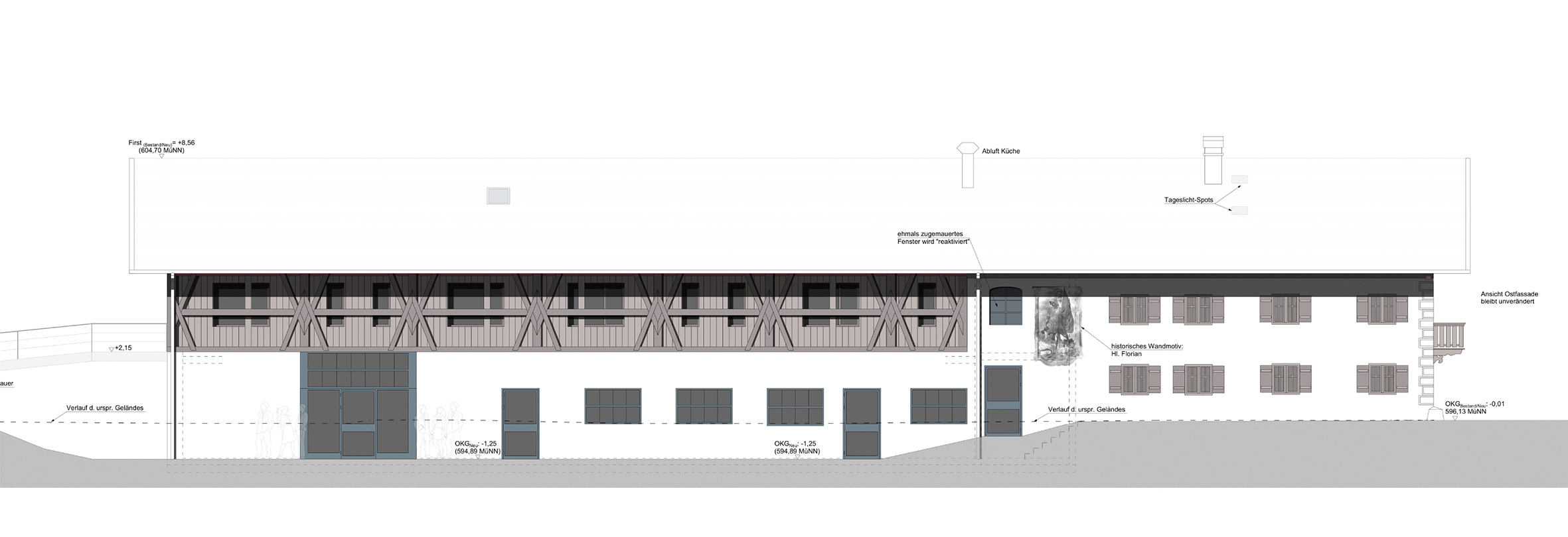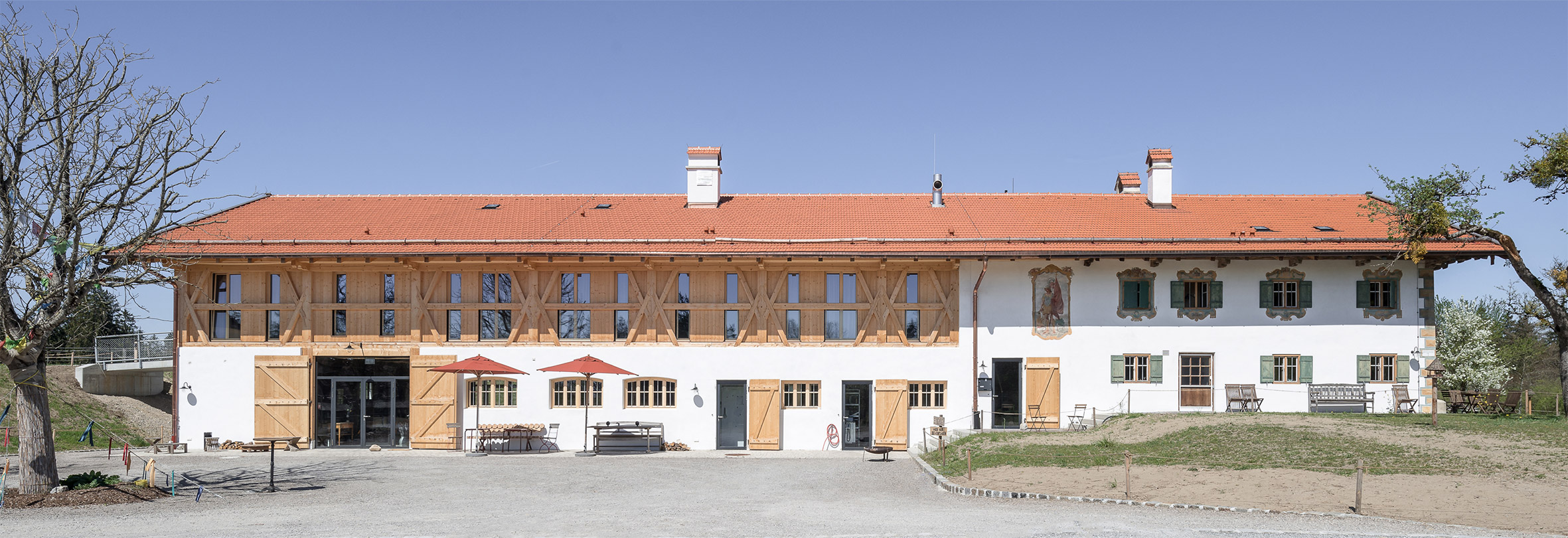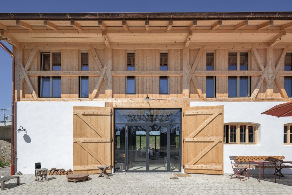 Langgestreckter, modern sanierter Stadel in Holzbauweise auf Ziegelmauerwerk mit verputztem Sockel. Im offenen Holzriegel sind hohe Fenstern und Schiebeelemente integriert. Eine seitliche Rampe erschließt das Obergeschoss. Im Erdgeschoss öffnen verglaste Scheunentore den Blick in die Gastronomie und Gesellschaftsräume.