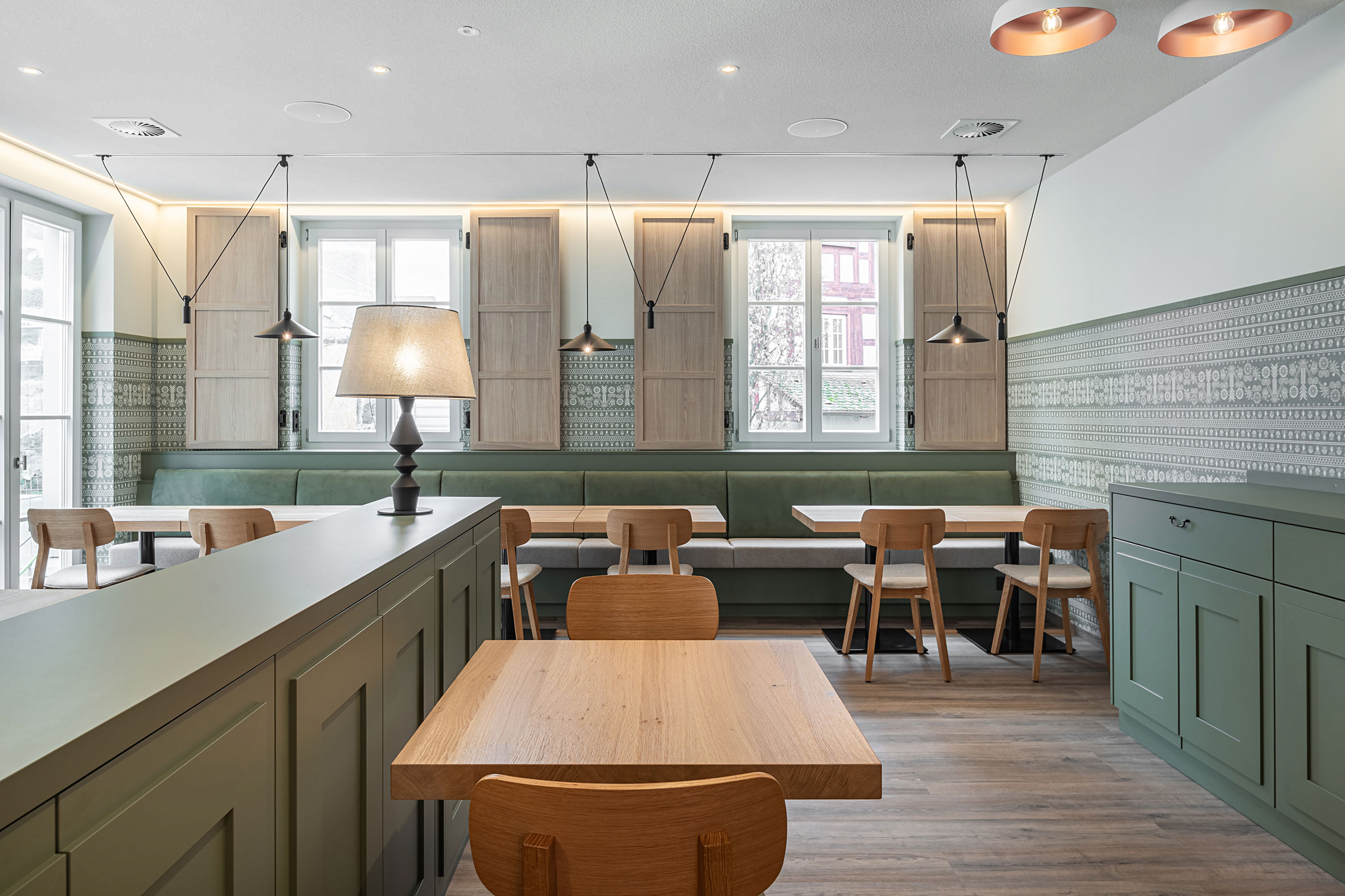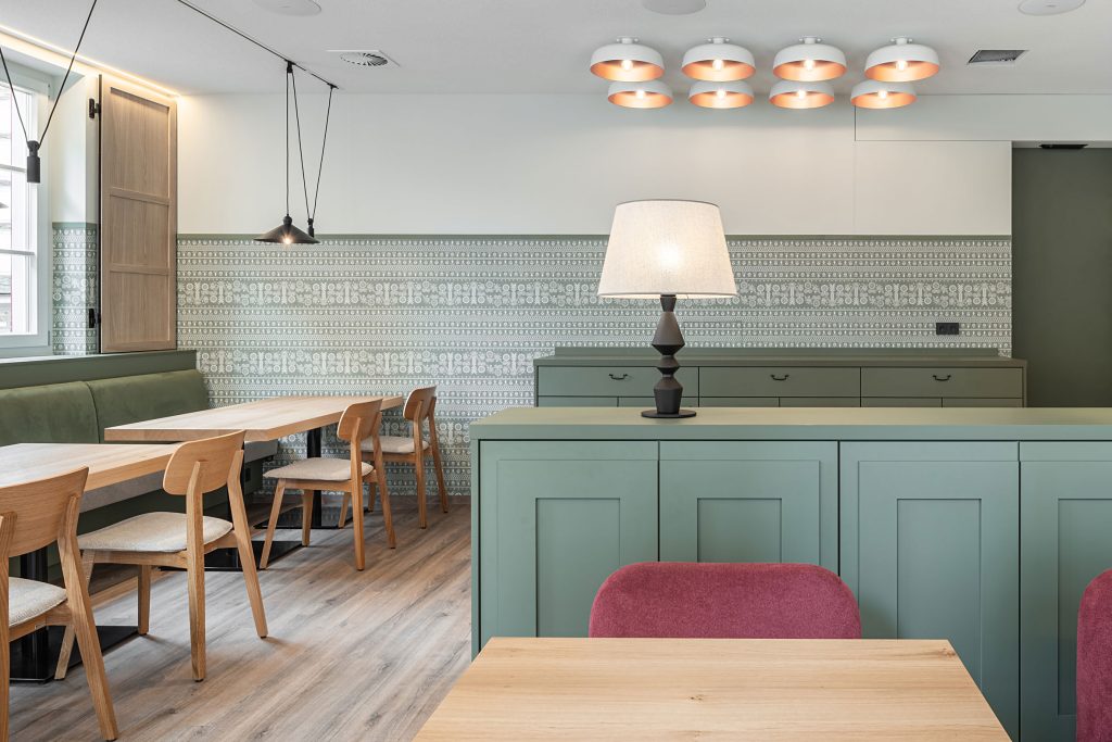 Helle Holzmöbel, grüne Akzente und sorgfältig ausgewählte Materialien schaffen eine freundliche und einladende Atmosphäre. Große Fenster mit Blick auf die historische Altstadt lassen viel Tageslicht herein und unterstreichen das harmonische Zusammenspiel von Moderne und Geschichte.