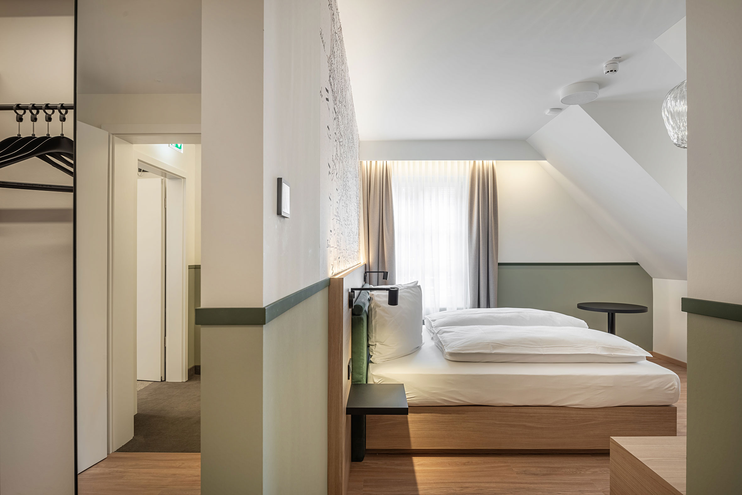 Die stilvoll gestalteten Hotelzimmer vereinen Komfort mit regionalem Bezug. Warme Holztöne, sanfte Grüntöne und eine historische Kartengrafik als Wandmotiv schaffen ein ruhiges, einladendes Ambiente. Durchdachte Details, hochwertige Materialien und der Blick auf die Fachwerkkulisse der Altstadt unterstreichen den besonderen Charme.