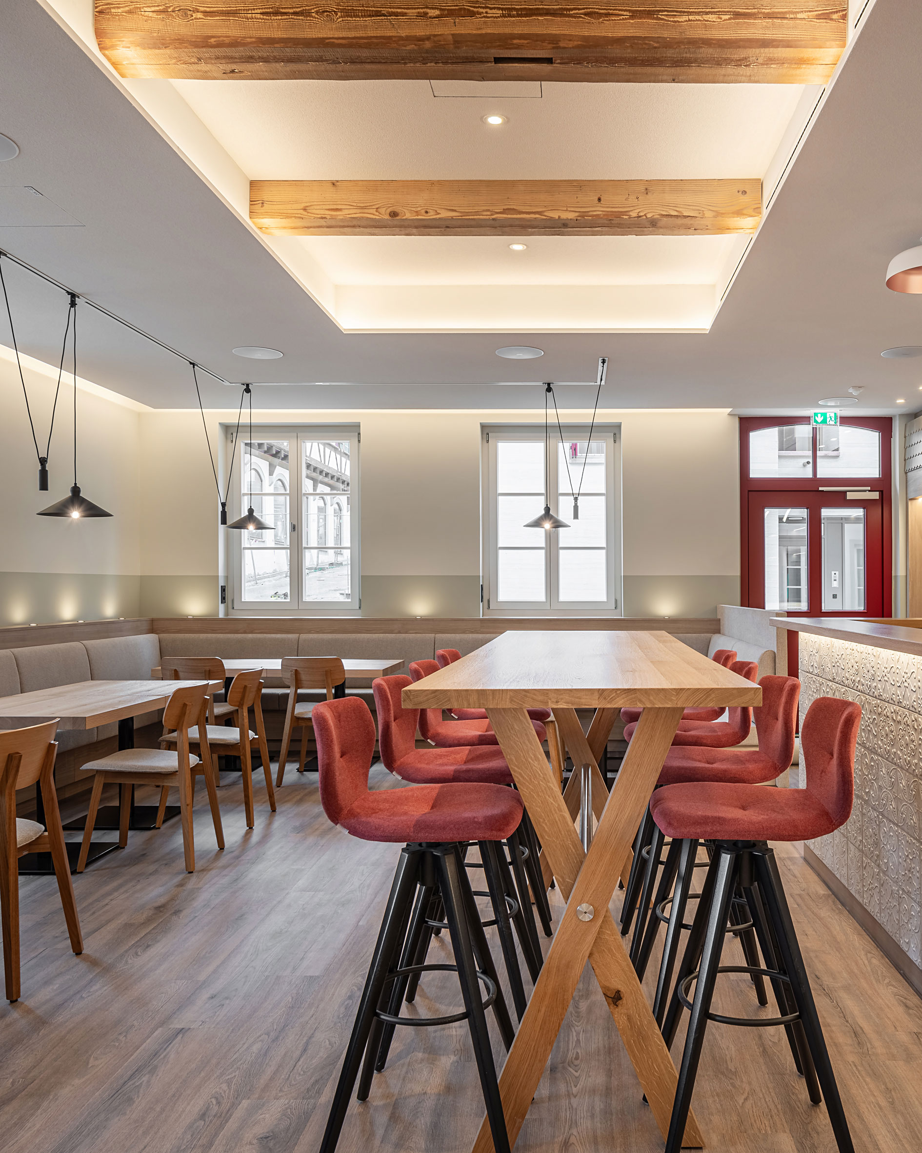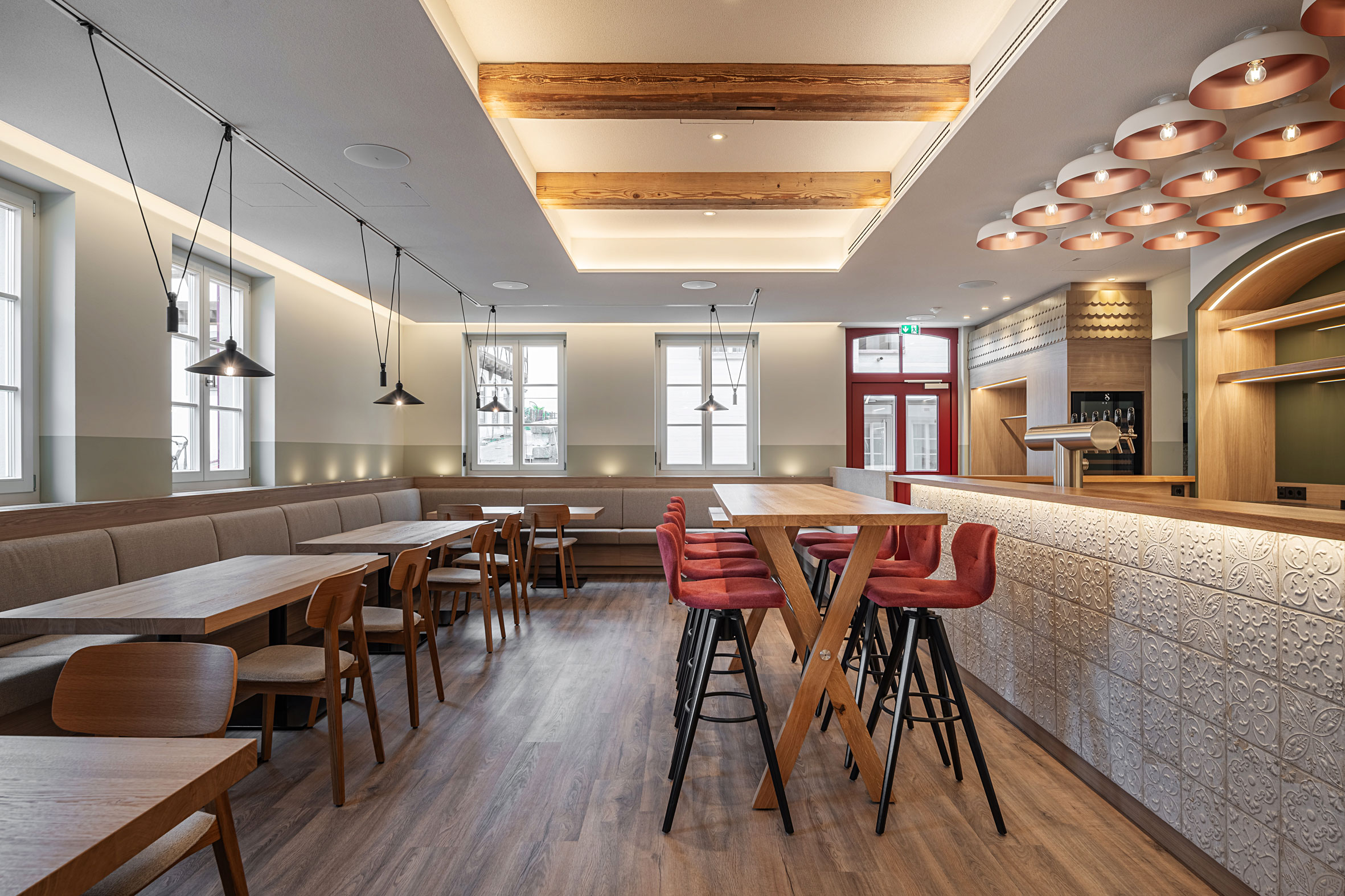 Natürliche Materialien wie Holz und warm abgestimmte Farbtöne schaffen einen harmonischen Kontrast zu den klaren Linien des zeitgemäßen Interieurs. Durchdachte Beleuchtung, freigelegte Deckenbalken und die strukturierte Barverkleidung verleihen dem Raum Charakter und laden zum Verweilen ein.
