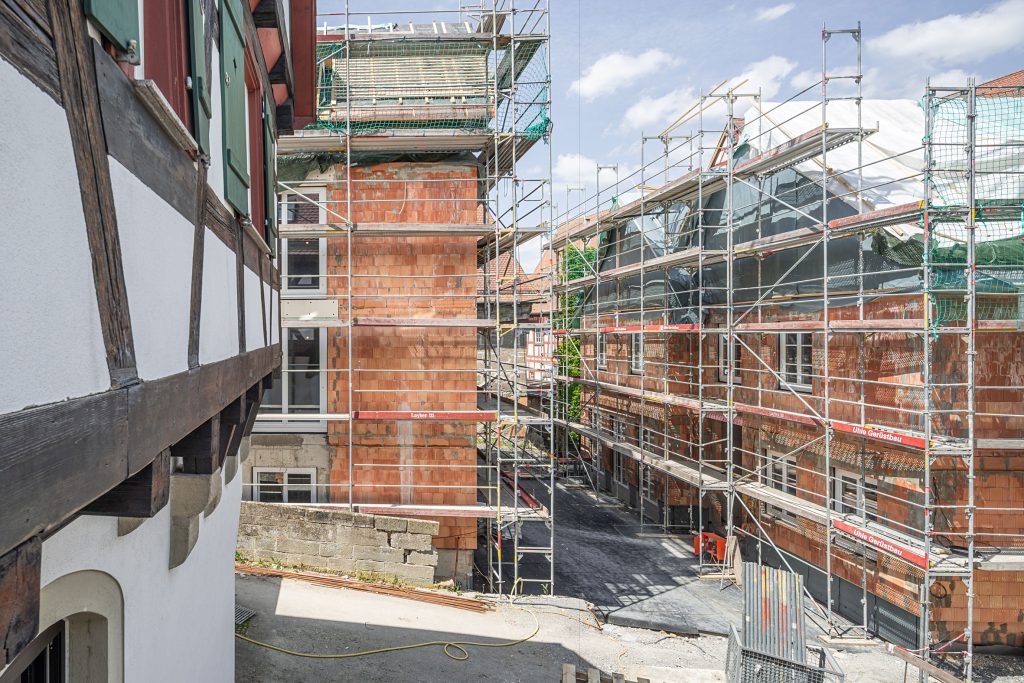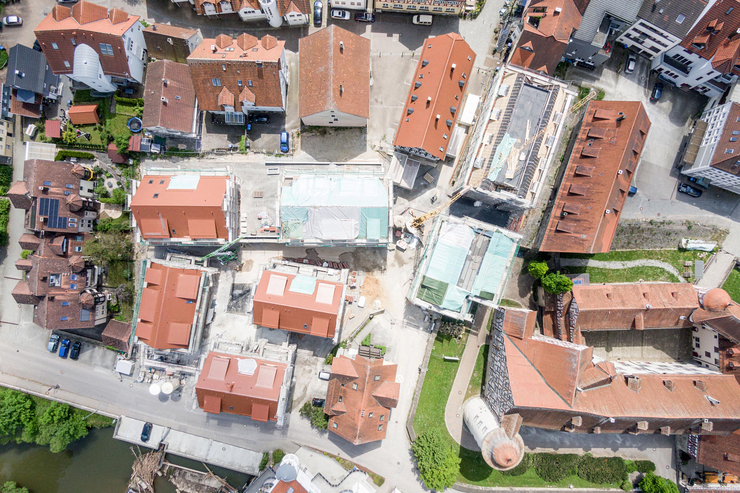 Zwischen Kocherufer und Altstadtkulisse liegen die neuen Wohn- und Geschäftsgebäude, die sich harmonisch in das historische Stadtbild einfügen. Die Neubauten mit roten Satteldächern und traditioneller Fassadengestaltung ergänzen die umliegenden Fachwerkhäuser und prägen die städtebauliche Entwicklung im Herzen Gaildorfs.