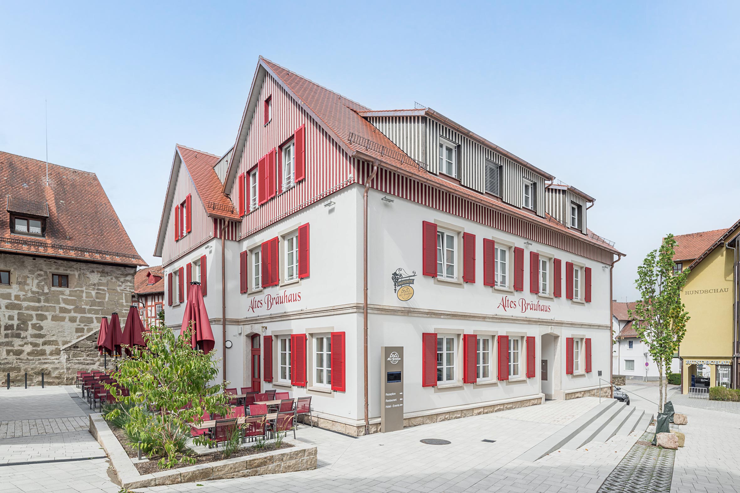 Das sanierte Alte Bräuhaus erstrahlt in neuem Glanz. Mit seiner charakteristischen Fassade, den roten Fensterläden und der modernen, zugleich traditionellen Architektur fügt sich das Gebäude harmonisch in die historische Altstadt ein. Heute beherbergt es Gastronomie und dient als zentrales Aushängeschild des neu entwickelten Bräuhaus-Areals.
