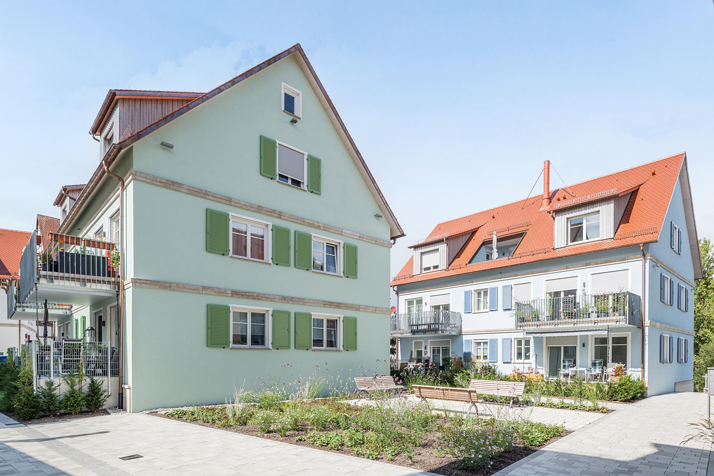 Die Wohngebäude sind harmonisch in das historische Stadtbild eingebunden. Mit ihren dezenten Pastellfarben, den traditionellen Fensterläden und den roten Satteldächern verbinden sie moderne Wohnqualität mit regionaltypischer Architektur. Begrünte Höfe und freundlich gestaltete Wege schaffen eine hohe Aufenthaltsqualität.