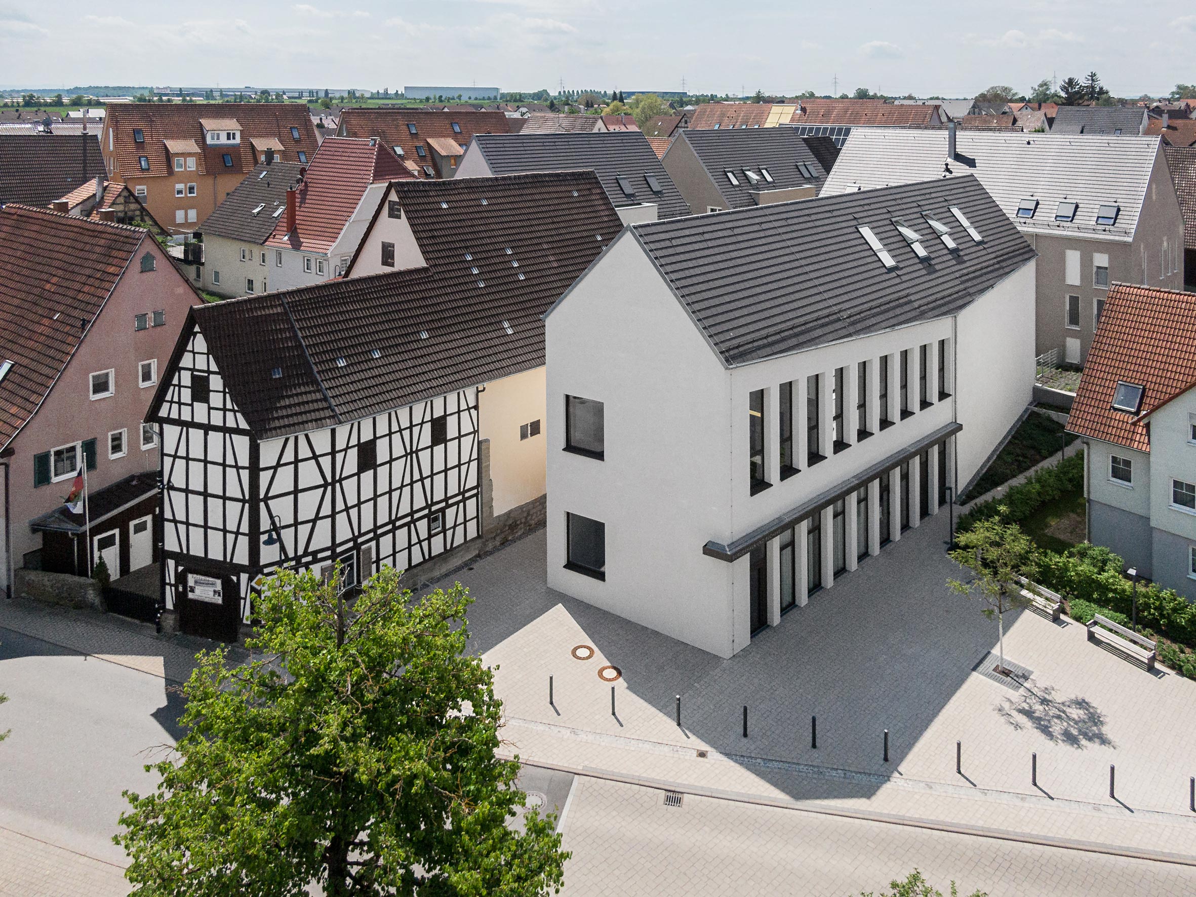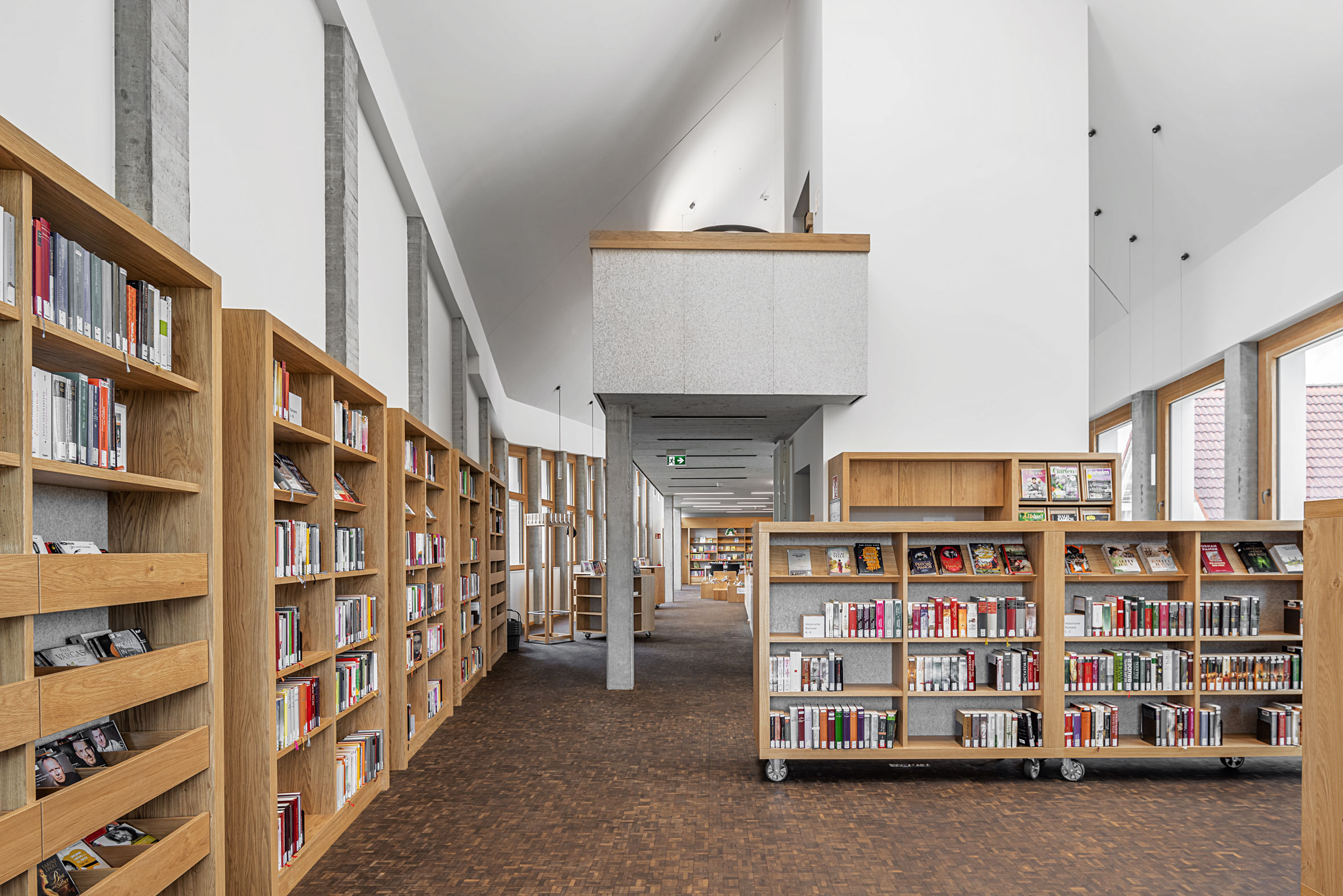 Im Inneren des Bürgerhauses verbindet eine z-förmige Erschließung Vorplatz und Hof. Der Römersaal öffnet sich zum Freien und kann – wetter- und anlassabhängig – erweitert werden; darüber entfaltet die Bibliothek eine Split-Level-Topografie unter dem geneigten Dach. Es entsteht ein Raum, der leise monumental wirkt: viel Holz, Sichtbeton, sorgfältig gesetzte Leuchten. Der Ort dient Lesenden, Vereinen, VHS-Kursen, Festen. Architektur als Infrastruktur des Miteinanders – robust in der Ausführung, wandlungsfähig in der Nutzung.