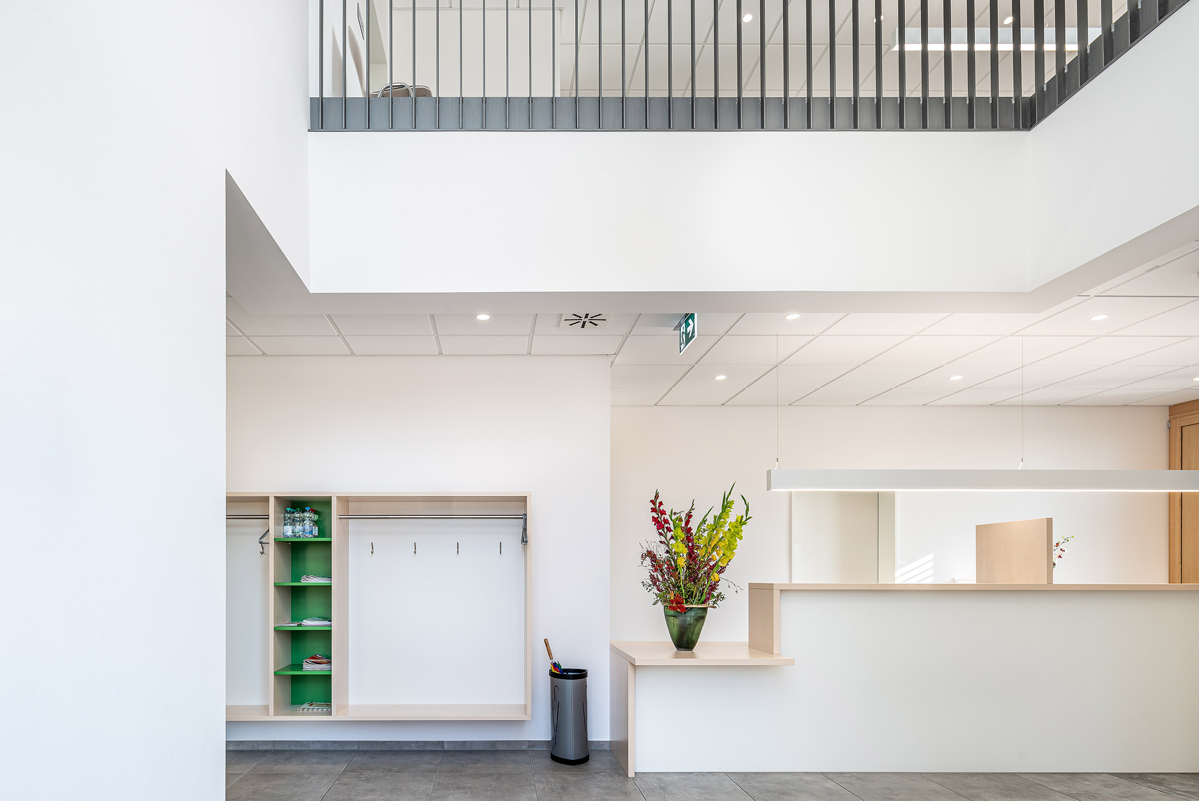 Der Eingangs- und Empfangsbereich ist durch helle Farben, klare Linien und eine offene Raumstruktur geprägt. Die Kombination aus weißen Flächen, warmen Holztönen und gezielten Farbakzenten schafft eine ruhige Atmosphäre. Die Beleuchtung und die großzügige Raumhöhe im Foyer unterstreichen den einladenden, funktionalen Charakter.