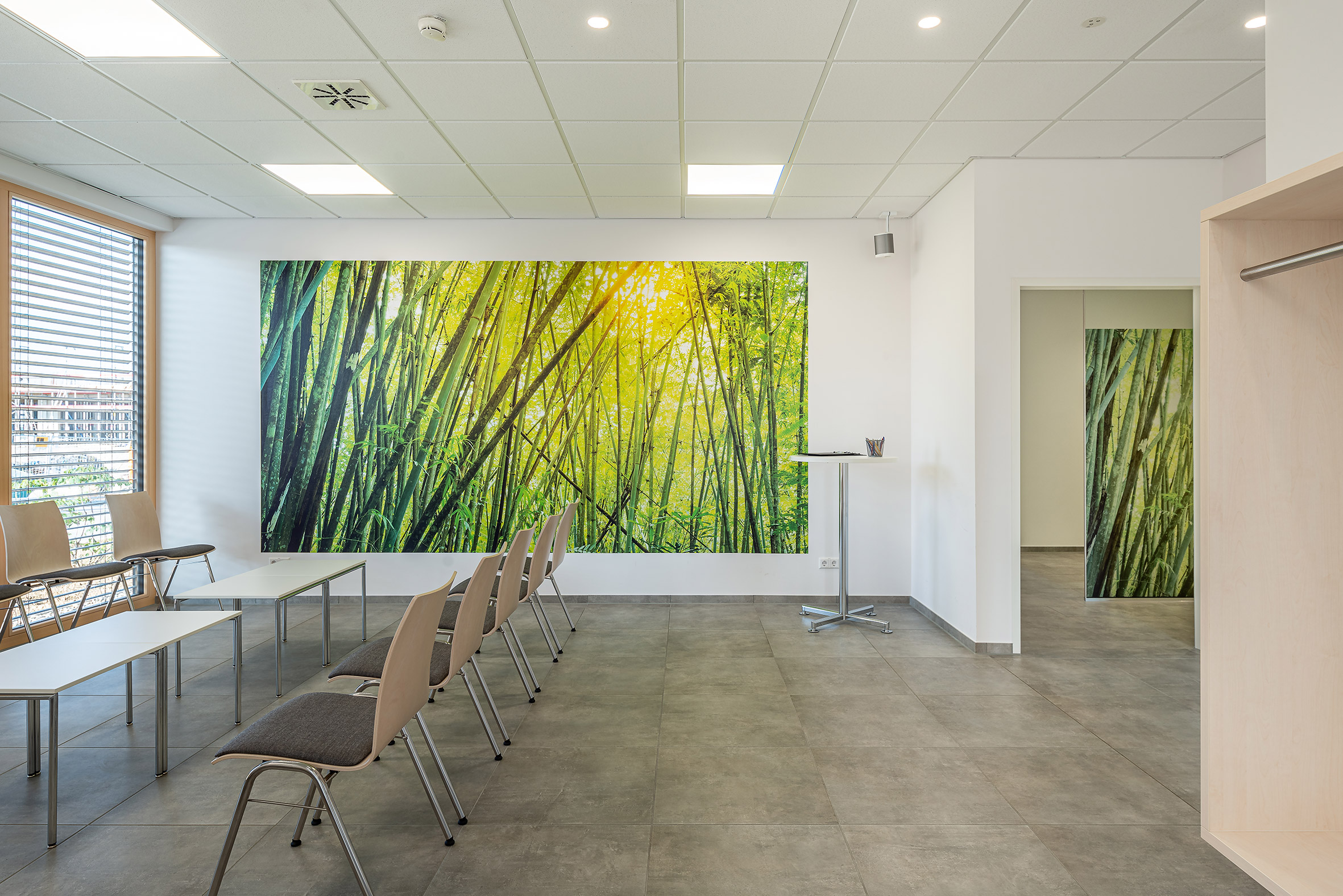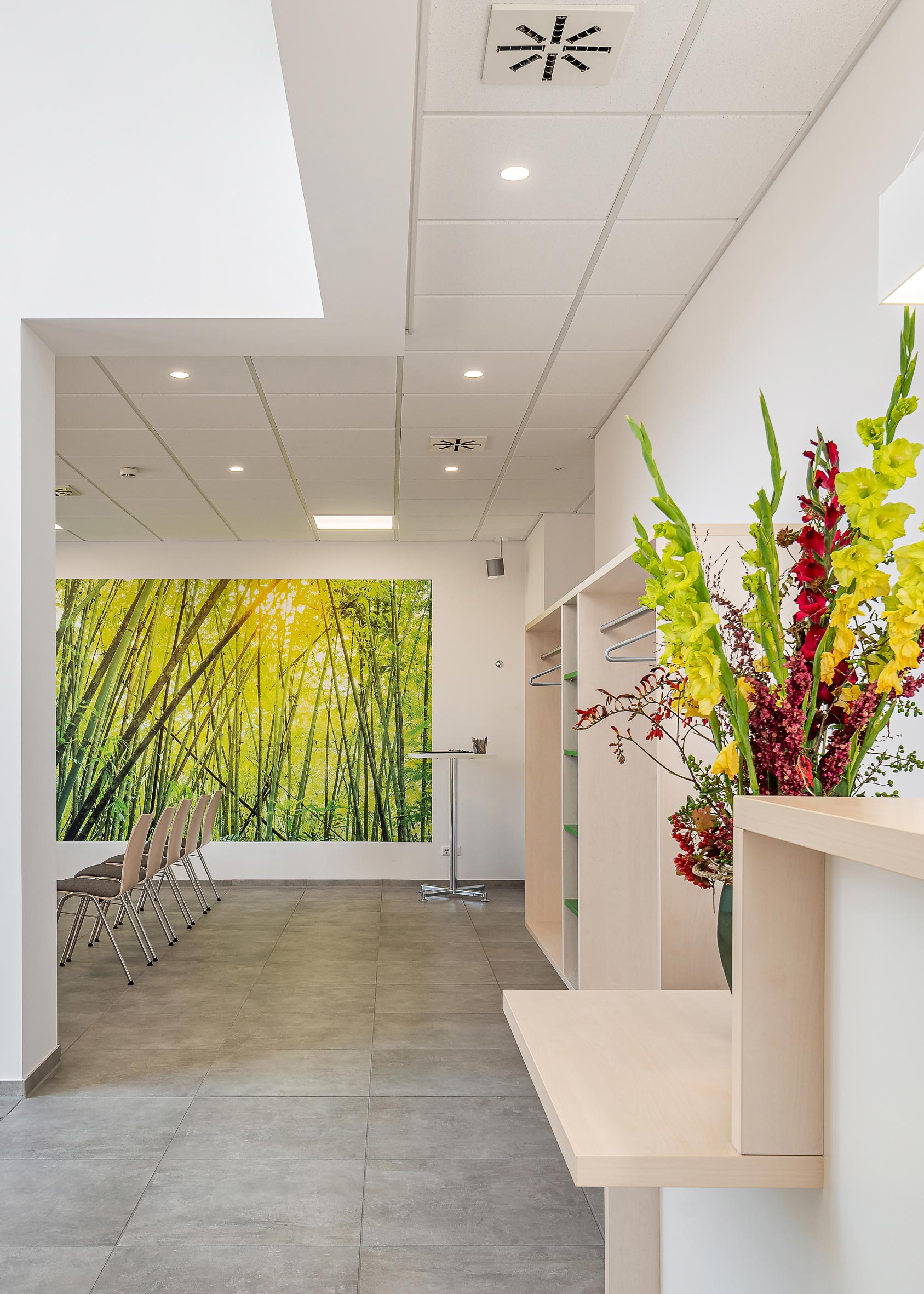 Der Wartebereich präsentiert sich hell, freundlich und klar strukturiert. Große Fensterflächen sorgen für viel Tageslicht, während das großformatige Wandbild eine beruhigende, naturnahe Atmosphäre schafft. Schlichte Möbel und dezente Farben tragen zu einer angenehmen Aufenthaltsqualität bei.