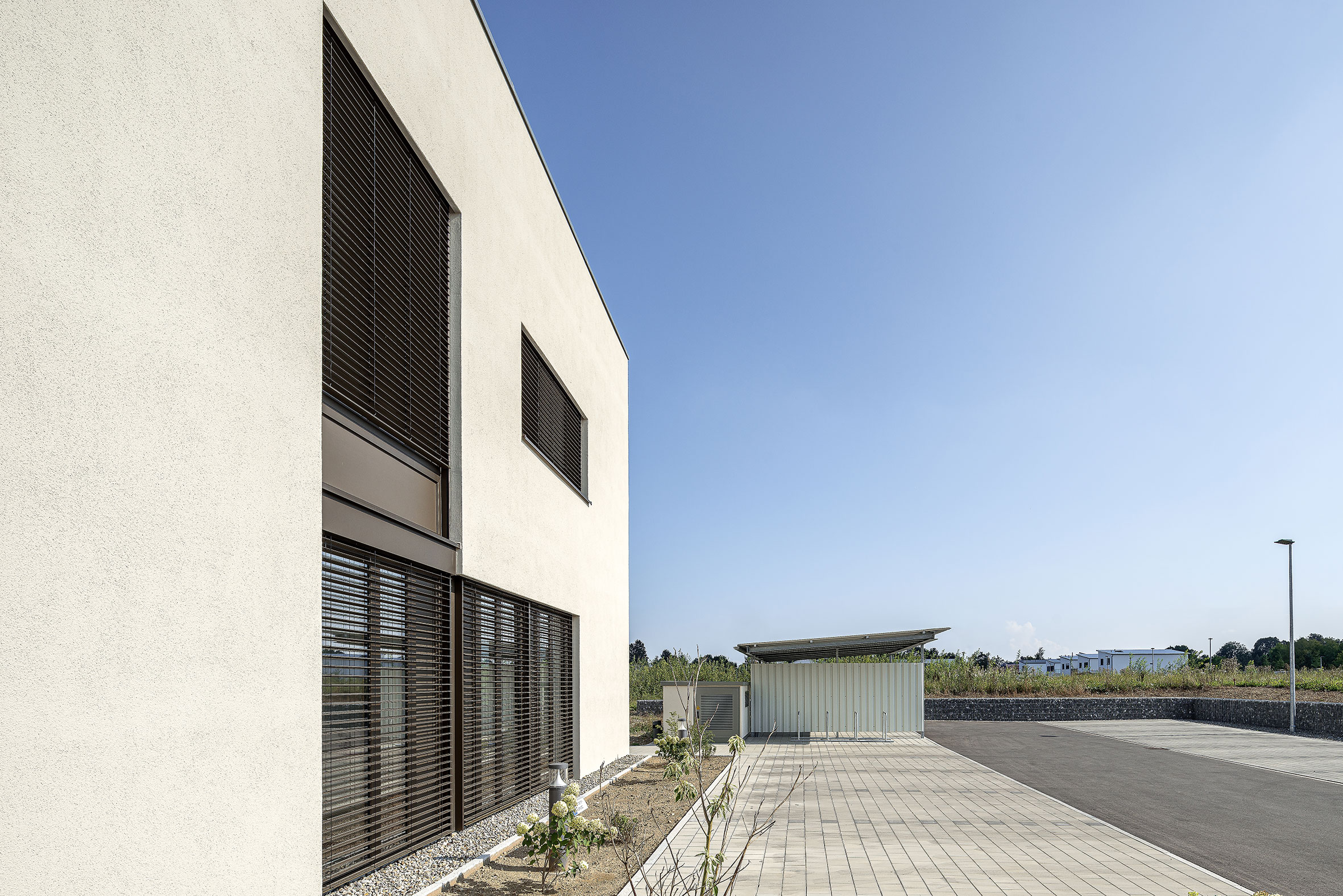 Der Baukörper mit seiner hellen Putzoberfläche und den großflächigen Fenstern wirkt durch seine reduzierte Formensprache ruhig und präzise. Vor dem Gebäude befindet sich eine großzügig angelegte Parkplatzfläche mit überdachten Stellplätzen und funktionalen Nebengebäuden.