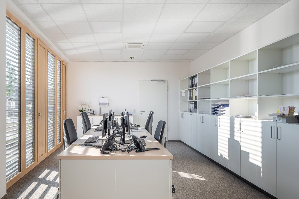 Der zweigeschossige Baukörper überzeugt durch seine klare, geometrische Formensprache und die helle, glatte Putzfassade. Große Fensterflächen mit außenliegenden Lamellen sorgen für Transparenz und natürliche Belichtung, während der zurückgesetzte Eingangsbereich mit hoher Glasfront einen einladenden Akzent setzt.