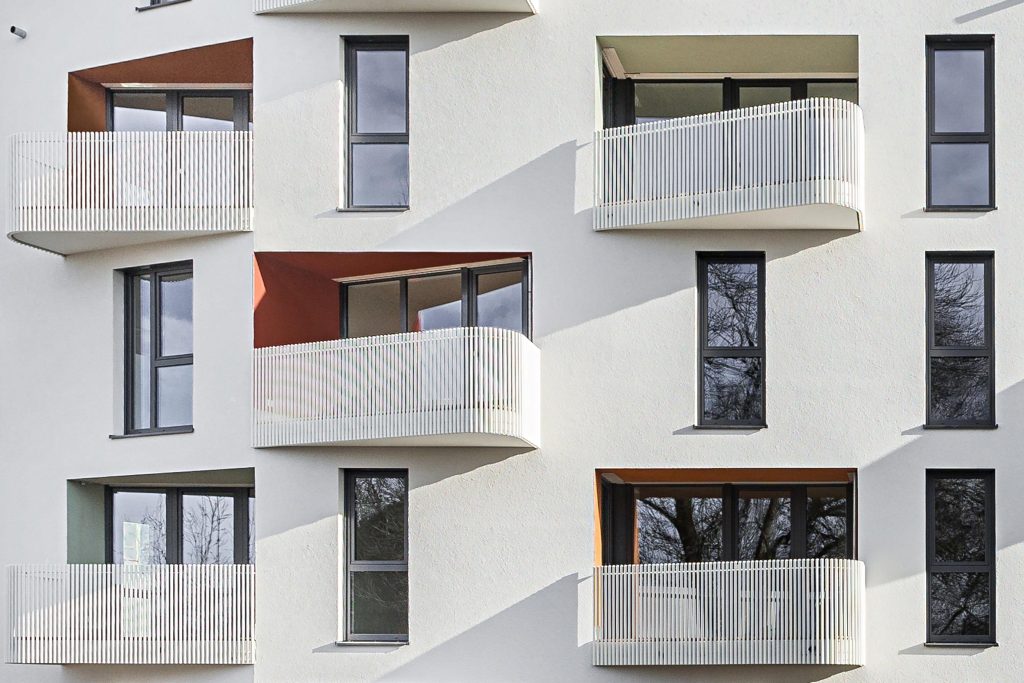 Der moderne Wohnbau zeigt eine klare, reduzierte Architektursprache mit weißer Putzfassade, asymmetrischer Fensteranordnung und auskragenden Balkonen. Durch farblich akzentuierte Rücksprünge in den Loggien und die plastische Fassadengestaltung entsteht ein lebendiges, zeitgenössisches Erscheinungsbild.
