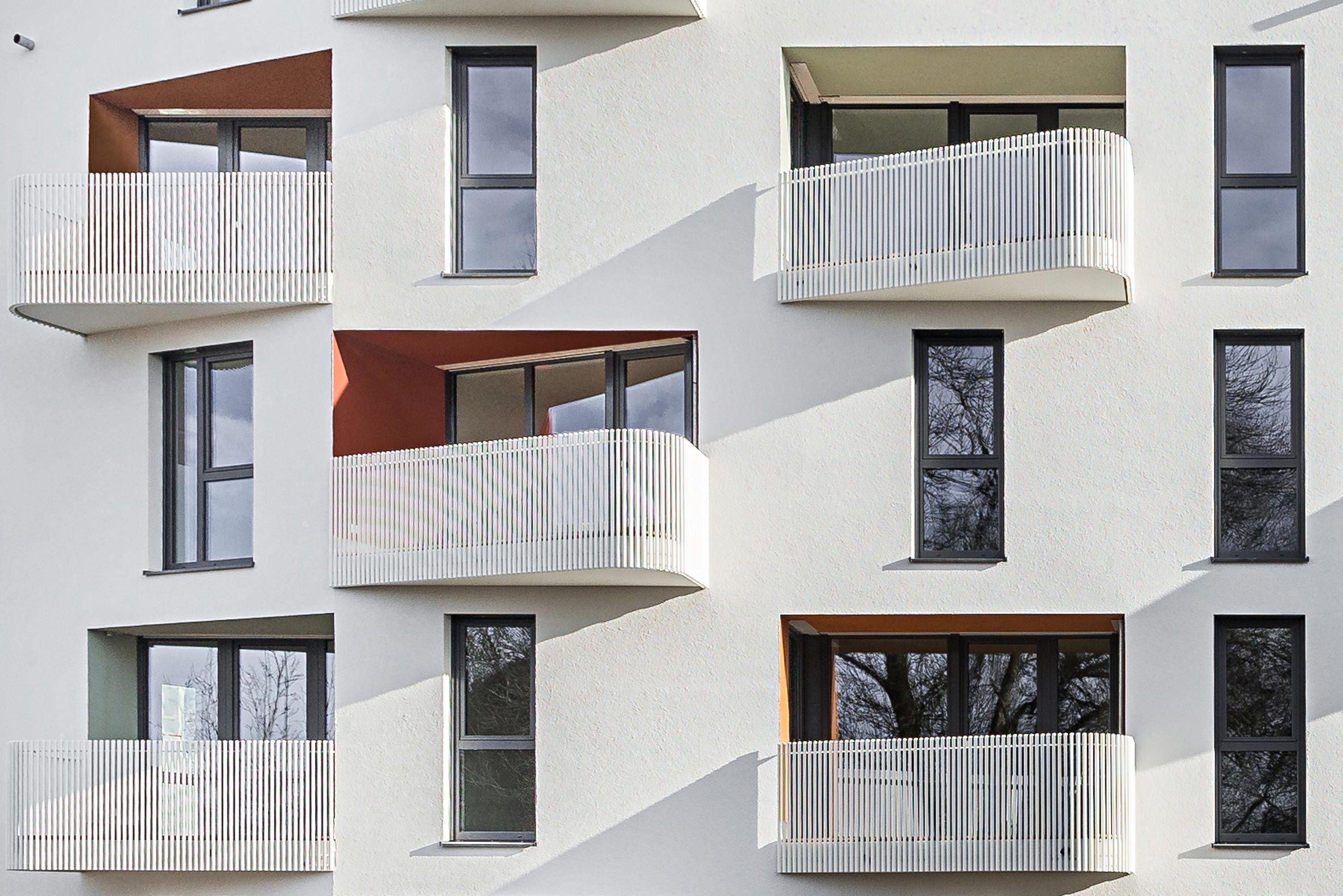 Fassadengestaltung mit plastisch ausgebildeten Balkonen und zurückversetzten Loggien. Die Kombination aus hellen Putzflächen, feingliedrigen vertikalen Geländern und farbig akzentuierten Rücksprüngen verleiht der Fassade Tiefe und Lebendigkeit. Wechselnde Licht- und Schattenspiele betonen die architektonische Struktur.