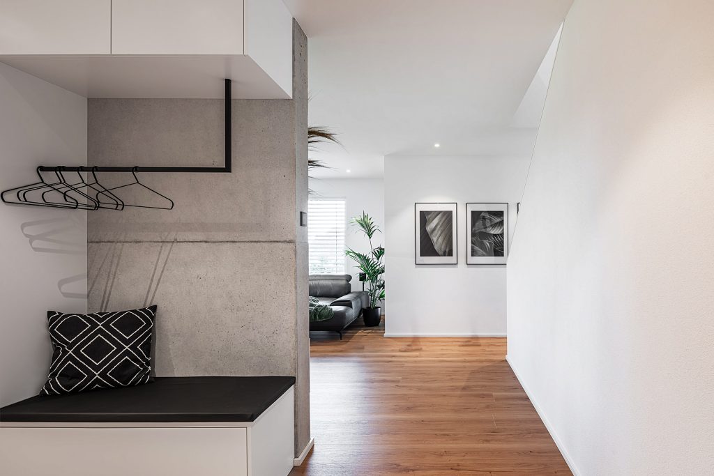 Sichtbeton, weißer Putz und Echtholzparkett prägen die Innenräume.